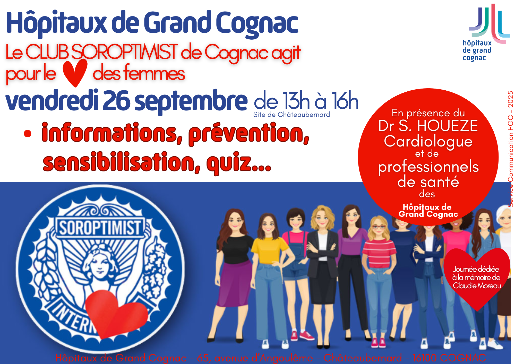 Les Hôpitaux de Grand Cognac et le Club Soroptimist de Cognac agissent pour le Cœur des Femmes et organisent une journée d’information qui se tiendra :